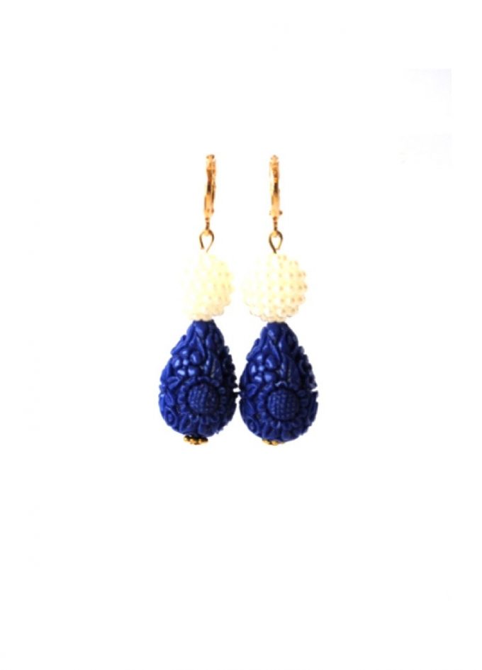 Oorbellen met parels en carved stone blauw. Carved stone is bloemvormige geslepen synthetische steen.